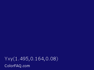 Yxy 1.495,0.164,0.08 Color is a dark indigo color and the nearest color is Arapawa #110c6c. Hex code #120e6b and RGB value is rgb(18,14,107). In RGB color space, this color is composed of 7% red, 5% green, 42% blue, In CMYK color space, this color is composed of 83% cyan, 87% magenta, 0% yellow , 58% black , In HSL color space, this color has a hue angle of 243° , 77% saturation and 24% lightness.