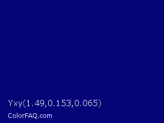 Yxy 1.49,0.153,0.065 Color is a dark blue color and the nearest color is Navy Blue #000080. Hex code #050578 and RGB value is rgb(5,5,120). In RGB color space, this color is composed of 2% red, 2% green, 47% blue, In CMYK color space, this color is composed of 96% cyan, 96% magenta, 0% yellow , 53% black , In HSL color space, this color has a hue angle of 240° , 92% saturation and 25% lightness.