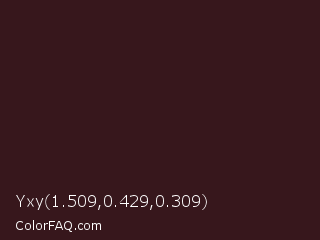 Yxy 1.509,0.429,0.309 Color is a very dark red color and the nearest color is Tamarind #341515. Hex code #37171c and RGB value is rgb(55,23,28). In RGB color space, this color is composed of 22% red, 9% green, 11% blue, In CMYK color space, this color is composed of 0% cyan, 58% magenta, 49% yellow , 78% black , In HSL color space, this color has a hue angle of 351° , 41% saturation and 15% lightness.