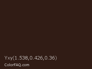Yxy 1.538,0.426,0.36 Color is a very dark color and the nearest color is Eclipse #311c17. Hex code #311c15 and RGB value is rgb(49,28,21). In RGB color space, this color is composed of 19% red, 11% green, 8% blue, In CMYK color space, this color is composed of 0% cyan, 43% magenta, 57% yellow , 81% black , In HSL color space, this color has a hue angle of 15° , 40% saturation and 14% lightness.