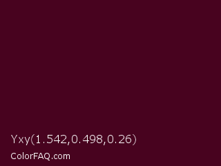 Yxy 1.542,0.498,0.26 Color is a very dark rose color and the nearest color is Castro #52001f. Hex code #48031f and RGB value is rgb(72,3,31). In RGB color space, this color is composed of 28% red, 1% green, 12% blue, In CMYK color space, this color is composed of 0% cyan, 96% magenta, 57% yellow , 72% black , In HSL color space, this color has a hue angle of 336° , 92% saturation and 15% lightness.