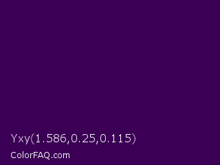 Yxy 1.586,0.25,0.115 Color is a very dark purple color and the nearest color is Ripe Plum #410056. Hex code #3b0055 and RGB value is rgb(59,0,85). In RGB color space, this color is composed of 23% red, 0% green, 33% blue, In CMYK color space, this color is composed of 31% cyan, 100% magenta, 0% yellow , 67% black , In HSL color space, this color has a hue angle of 282° , 100% saturation and 17% lightness.