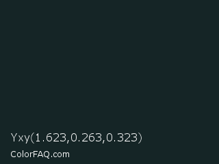 Yxy 1.623,0.263,0.323 Color is a very dark cyan color and the nearest color is Dark Jungle Green #1a2421. Hex code #152526 and RGB value is rgb(21,37,38). In RGB color space, this color is composed of 8% red, 15% green, 15% blue, In CMYK color space, this color is composed of 45% cyan, 3% magenta, 0% yellow , 85% black , In HSL color space, this color has a hue angle of 184° , 29% saturation and 12% lightness.