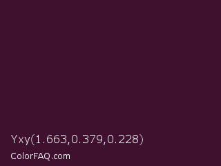 Yxy 1.663,0.379,0.228 Color is a very dark magenta color and the nearest color is Barossa #44012d. Hex code #3f112f and RGB value is rgb(63,17,47). In RGB color space, this color is composed of 25% red, 7% green, 18% blue, In CMYK color space, this color is composed of 0% cyan, 73% magenta, 25% yellow , 75% black , In HSL color space, this color has a hue angle of 321° , 58% saturation and 16% lightness.