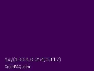 Yxy 1.664,0.254,0.117 Color is a very dark purple color and the nearest color is Ripe Plum #410056. Hex code #3d0056 and RGB value is rgb(61,0,86). In RGB color space, this color is composed of 24% red, 0% green, 34% blue, In CMYK color space, this color is composed of 29% cyan, 100% magenta, 0% yellow , 66% black , In HSL color space, this color has a hue angle of 283° , 100% saturation and 17% lightness.