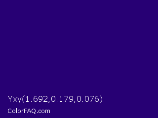 Yxy 1.692,0.179,0.076 Color is a dark indigo color and the nearest color is Deep Blue #220878. Hex code #270074 and RGB value is rgb(39,0,116). In RGB color space, this color is composed of 15% red, 0% green, 45% blue, In CMYK color space, this color is composed of 66% cyan, 100% magenta, 0% yellow , 55% black , In HSL color space, this color has a hue angle of 260° , 100% saturation and 23% lightness.