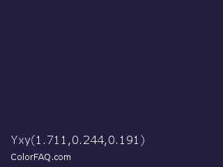 Yxy 1.711,0.244,0.191 Color is a very dark indigo color and the nearest color is Ebony Clay #26283b. Hex code #261e40 and RGB value is rgb(38,30,64). In RGB color space, this color is composed of 15% red, 12% green, 25% blue, In CMYK color space, this color is composed of 41% cyan, 53% magenta, 0% yellow , 75% black , In HSL color space, this color has a hue angle of 254° , 36% saturation and 18% lightness.