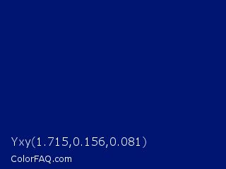 Yxy 1.715,0.156,0.081 Color is a very dark blue color and the nearest color is Dark Imperial Blue #00147e. Hex code #001472 and RGB value is rgb(0,20,114). In RGB color space, this color is composed of 0% red, 8% green, 45% blue, In CMYK color space, this color is composed of 100% cyan, 82% magenta, 0% yellow , 55% black , In HSL color space, this color has a hue angle of 229° , 100% saturation and 22% lightness.