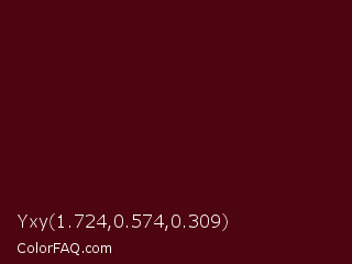 Yxy 1.724,0.574,0.309 Color is a very dark red color and the nearest color is Cab Sav #4d0a18. Hex code #4d0510 and RGB value is rgb(77,5,16). In RGB color space, this color is composed of 30% red, 2% green, 6% blue, In CMYK color space, this color is composed of 0% cyan, 94% magenta, 79% yellow , 70% black , In HSL color space, this color has a hue angle of 351° , 88% saturation and 16% lightness.