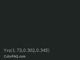 Yxy 1.73,0.302,0.345 Color is a very dark green color and the nearest color is Dark Jungle Green #1a2421. Hex code #1f2522 and RGB value is rgb(31,37,34). In RGB color space, this color is composed of 12% red, 15% green, 13% blue, In CMYK color space, this color is composed of 16% cyan, 0% magenta, 8% yellow , 85% black , In HSL color space, this color has a hue angle of 150° , 9% saturation and 13% lightness.