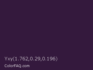 Yxy 1.762,0.29,0.196 Color is a very dark purple color and the nearest color is Dark Purple #301934. Hex code #34193d and RGB value is rgb(52,25,61). In RGB color space, this color is composed of 20% red, 10% green, 24% blue, In CMYK color space, this color is composed of 15% cyan, 59% magenta, 0% yellow , 76% black , In HSL color space, this color has a hue angle of 285° , 42% saturation and 17% lightness.
