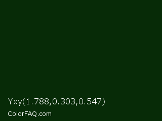 Yxy 1.788,0.303,0.547 Color is a very dark green color and the nearest color is Deep Fir #002900. Hex code #072b07 and RGB value is rgb(7,43,7). In RGB color space, this color is composed of 3% red, 17% green, 3% blue, In CMYK color space, this color is composed of 84% cyan, 0% magenta, 84% yellow , 83% black , In HSL color space, this color has a hue angle of 120° , 72% saturation and 10% lightness.
