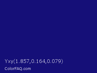 Yxy 1.857,0.164,0.079 Color is a dark indigo color and the nearest color is Deep Koamaru #1b127b. Hex code #150f78 and RGB value is rgb(21,15,120). In RGB color space, this color is composed of 8% red, 6% green, 47% blue, In CMYK color space, this color is composed of 83% cyan, 88% magenta, 0% yellow , 53% black , In HSL color space, this color has a hue angle of 243° , 78% saturation and 26% lightness.