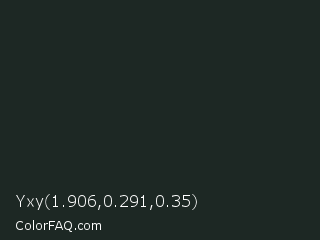 Yxy 1.906,0.291,0.35 Color is a very dark green color and the nearest color is Dark Jungle Green #1a2421. Hex code #1d2824 and RGB value is rgb(29,40,36). In RGB color space, this color is composed of 11% red, 16% green, 14% blue, In CMYK color space, this color is composed of 28% cyan, 0% magenta, 10% yellow , 84% black , In HSL color space, this color has a hue angle of 158° , 16% saturation and 14% lightness.