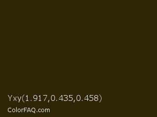 Yxy 1.917,0.435,0.458 Color is a very dark yellow color and the nearest color is Onion #2f270e. Hex code #2e2506 and RGB value is rgb(46,37,6). In RGB color space, this color is composed of 18% red, 15% green, 2% blue, In CMYK color space, this color is composed of 0% cyan, 20% magenta, 87% yellow , 82% black , In HSL color space, this color has a hue angle of 47° , 77% saturation and 10% lightness.