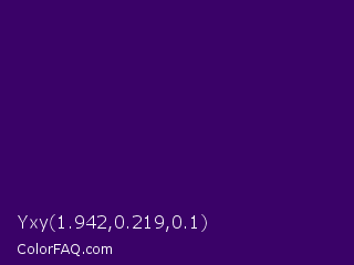 Yxy 1.942,0.219,0.1 Color is a very dark purple color and the nearest color is Deep Violet #330066. Hex code #3a0268 and RGB value is rgb(58,2,104). In RGB color space, this color is composed of 23% red, 1% green, 41% blue, In CMYK color space, this color is composed of 44% cyan, 98% magenta, 0% yellow , 59% black , In HSL color space, this color has a hue angle of 273° , 96% saturation and 21% lightness.
