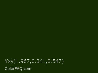 Yxy 1.967,0.341,0.547 Color is a almost black green color and the nearest color is Deep Forest Green #182d09. Hex code #152c03 and RGB value is rgb(21,44,3). In RGB color space, this color is composed of 8% red, 17% green, 1% blue, In CMYK color space, this color is composed of 52% cyan, 0% magenta, 93% yellow , 83% black , In HSL color space, this color has a hue angle of 94° , 87% saturation and 9% lightness.