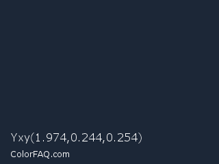 Yxy 1.974,0.244,0.254 Color is a very dark blue color and the nearest color is Yankees Blue #1c2841. Hex code #1c2737 and RGB value is rgb(28,39,55). In RGB color space, this color is composed of 11% red, 15% green, 22% blue, In CMYK color space, this color is composed of 49% cyan, 29% magenta, 0% yellow , 78% black , In HSL color space, this color has a hue angle of 216° , 33% saturation and 16% lightness.