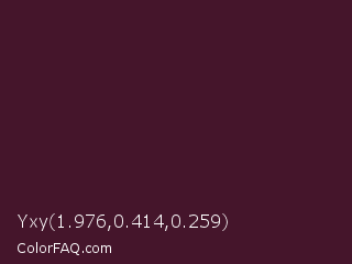 Yxy 1.976,0.414,0.259 Color is a very dark rose color and the nearest color is Crater Brown #462425. Hex code #45152b and RGB value is rgb(69,21,43). In RGB color space, this color is composed of 27% red, 8% green, 17% blue, In CMYK color space, this color is composed of 0% cyan, 70% magenta, 38% yellow , 73% black , In HSL color space, this color has a hue angle of 333° , 53% saturation and 18% lightness.