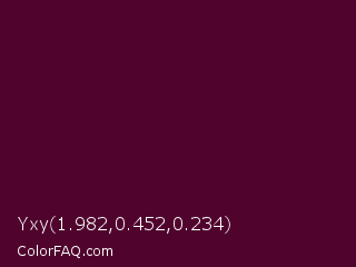 Yxy 1.982,0.452,0.234 Color is a very dark rose color and the nearest color is Blackberry #4d0135. Hex code #50042d and RGB value is rgb(80,4,45). In RGB color space, this color is composed of 31% red, 2% green, 18% blue, In CMYK color space, this color is composed of 0% cyan, 95% magenta, 44% yellow , 69% black , In HSL color space, this color has a hue angle of 328° , 90% saturation and 16% lightness.