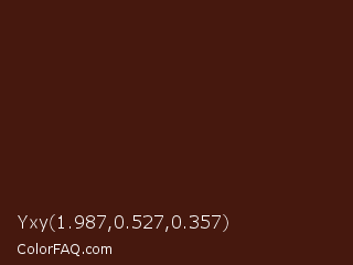 Yxy 1.987,0.527,0.357 Color is a very dark red color and the nearest color is Van Cleef #49170c. Hex code #46180e and RGB value is rgb(70,24,14). In RGB color space, this color is composed of 27% red, 9% green, 5% blue, In CMYK color space, this color is composed of 0% cyan, 66% magenta, 80% yellow , 73% black , In HSL color space, this color has a hue angle of 11° , 67% saturation and 16% lightness.