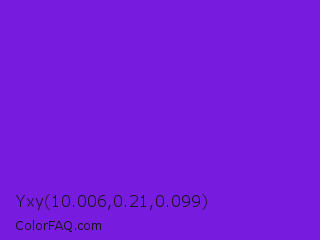 Yxy 10.006,0.21,0.099 Color is a normal violet color and the nearest color is Blue Violet #8a2be2. Hex code #771bde and RGB value is rgb(119,27,222). In RGB color space, this color is composed of 47% red, 11% green, 87% blue, In CMYK color space, this color is composed of 46% cyan, 88% magenta, 0% yellow , 13% black , In HSL color space, this color has a hue angle of 268° , 78% saturation and 49% lightness.