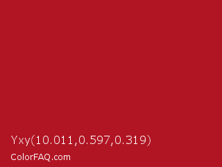 Yxy 10.011,0.597,0.319 Color is a normal red color and the nearest color is Carnelian #b31b1b. Hex code #b11524 and RGB value is rgb(177,21,36). In RGB color space, this color is composed of 69% red, 8% green, 14% blue, In CMYK color space, this color is composed of 0% cyan, 88% magenta, 80% yellow , 31% black , In HSL color space, this color has a hue angle of 354° , 79% saturation and 39% lightness.