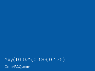 Yxy 10.025,0.183,0.176 Color is a normal blue color and the nearest color is Endeavour #0056a7. Hex code #055aa4 and RGB value is rgb(5,90,164). In RGB color space, this color is composed of 2% red, 35% green, 64% blue, In CMYK color space, this color is composed of 97% cyan, 45% magenta, 0% yellow , 36% black , In HSL color space, this color has a hue angle of 208° , 94% saturation and 33% lightness.