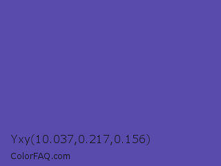Yxy 10.037,0.217,0.156 Color is a normal indigo color and the nearest color is Plump Purple #5946b2. Hex code #584bac and RGB value is rgb(88,75,172). In RGB color space, this color is composed of 35% red, 29% green, 67% blue, In CMYK color space, this color is composed of 49% cyan, 56% magenta, 0% yellow , 33% black , In HSL color space, this color has a hue angle of 248° , 39% saturation and 48% lightness.