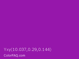 Yxy 10.037,0.29,0.144 Color is a normal purple color and the nearest color is Violet Eggplant #991199. Hex code #9617ab and RGB value is rgb(150,23,171). In RGB color space, this color is composed of 59% red, 9% green, 67% blue, In CMYK color space, this color is composed of 12% cyan, 87% magenta, 0% yellow , 33% black , In HSL color space, this color has a hue angle of 291° , 76% saturation and 38% lightness.