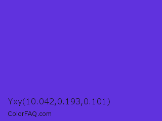 Yxy 10.042,0.193,0.101 Color is a normal indigo color and the nearest color is Purple Heart Crayola #652dc1. Hex code #6032de and RGB value is rgb(96,50,222). In RGB color space, this color is composed of 38% red, 20% green, 87% blue, In CMYK color space, this color is composed of 57% cyan, 77% magenta, 0% yellow , 13% black , In HSL color space, this color has a hue angle of 256° , 72% saturation and 53% lightness.