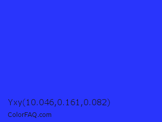 Yxy 10.046,0.161,0.082 Color is a normal blue color and the nearest color is Palatinate Blue #273be2. Hex code #2935fc and RGB value is rgb(41,53,252). In RGB color space, this color is composed of 16% red, 21% green, 99% blue, In CMYK color space, this color is composed of 84% cyan, 79% magenta, 0% yellow , 1% black , In HSL color space, this color has a hue angle of 237° , 97% saturation and 57% lightness.