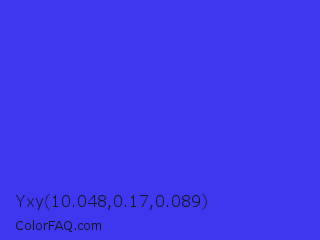 Yxy 10.048,0.17,0.089 Color is a normal indigo color and the nearest color is Palatinate Blue #273be2. Hex code #3f36f0 and RGB value is rgb(63,54,240). In RGB color space, this color is composed of 25% red, 21% green, 94% blue, In CMYK color space, this color is composed of 74% cyan, 78% magenta, 0% yellow , 6% black , In HSL color space, this color has a hue angle of 243° , 86% saturation and 58% lightness.