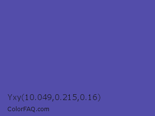 Yxy 10.049,0.215,0.16 Color is a normal indigo color and the nearest color is Plump Purple #5946b2. Hex code #534daa and RGB value is rgb(83,77,170). In RGB color space, this color is composed of 33% red, 30% green, 67% blue, In CMYK color space, this color is composed of 51% cyan, 55% magenta, 0% yellow , 33% black , In HSL color space, this color has a hue angle of 244° , 38% saturation and 48% lightness.
