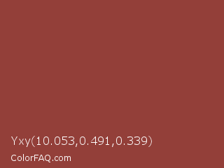 Yxy 10.053,0.491,0.339 Color is a normal red color and the nearest color is Sanguine Brown #8d3d38. Hex code #933f39 and RGB value is rgb(147,63,57). In RGB color space, this color is composed of 58% red, 25% green, 22% blue, In CMYK color space, this color is composed of 0% cyan, 57% magenta, 61% yellow , 42% black , In HSL color space, this color has a hue angle of 4° , 44% saturation and 40% lightness.
