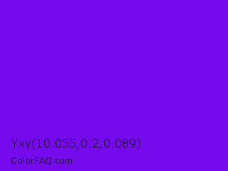 Yxy 10.055,0.2,0.089 Color is a normal violet color and the nearest color is Electric Indigo #6f00ff. Hex code #750aec and RGB value is rgb(117,10,236). In RGB color space, this color is composed of 46% red, 4% green, 93% blue, In CMYK color space, this color is composed of 50% cyan, 96% magenta, 0% yellow , 7% black , In HSL color space, this color has a hue angle of 268° , 92% saturation and 48% lightness.