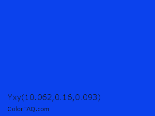 Yxy 10.062,0.16,0.093 Color is a normal blue color and the nearest color is Blue RYB #0247fe. Hex code #0b42ed and RGB value is rgb(11,66,237). In RGB color space, this color is composed of 4% red, 26% green, 93% blue, In CMYK color space, this color is composed of 95% cyan, 72% magenta, 0% yellow , 7% black , In HSL color space, this color has a hue angle of 225° , 91% saturation and 49% lightness.