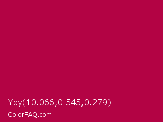 Yxy 10.066,0.545,0.279 Color is a normal rose color and the nearest color is Shiraz #b20931. Hex code #b30344 and RGB value is rgb(179,3,68). In RGB color space, this color is composed of 70% red, 1% green, 27% blue, In CMYK color space, this color is composed of 0% cyan, 98% magenta, 62% yellow , 30% black , In HSL color space, this color has a hue angle of 338° , 97% saturation and 36% lightness.