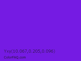Yxy 10.067,0.205,0.096 Color is a normal violet color and the nearest color is Blue Violet #8a2be2. Hex code #751be3 and RGB value is rgb(117,27,227). In RGB color space, this color is composed of 46% red, 11% green, 89% blue, In CMYK color space, this color is composed of 48% cyan, 88% magenta, 0% yellow , 11% black , In HSL color space, this color has a hue angle of 267° , 79% saturation and 50% lightness.