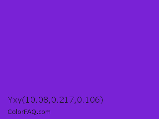 Yxy 10.08,0.217,0.106 Color is a normal violet color and the nearest color is Blue Violet #8a2be2. Hex code #7922d6 and RGB value is rgb(121,34,214). In RGB color space, this color is composed of 47% red, 13% green, 84% blue, In CMYK color space, this color is composed of 43% cyan, 84% magenta, 0% yellow , 16% black , In HSL color space, this color has a hue angle of 269° , 73% saturation and 49% lightness.