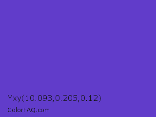 Yxy 10.093,0.205,0.12 Color is a normal indigo color and the nearest color is Purple Heart Crayola #652dc1. Hex code #613cca and RGB value is rgb(97,60,202). In RGB color space, this color is composed of 38% red, 24% green, 79% blue, In CMYK color space, this color is composed of 52% cyan, 70% magenta, 0% yellow , 21% black , In HSL color space, this color has a hue angle of 256° , 57% saturation and 51% lightness.