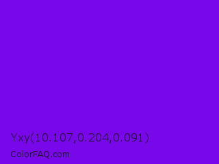 Yxy 10.107,0.204,0.091 Color is a normal violet color and the nearest color is Violet Color Wheel #7f00ff. Hex code #7808ea and RGB value is rgb(120,8,234). In RGB color space, this color is composed of 47% red, 3% green, 92% blue, In CMYK color space, this color is composed of 49% cyan, 97% magenta, 0% yellow , 8% black , In HSL color space, this color has a hue angle of 270° , 93% saturation and 47% lightness.