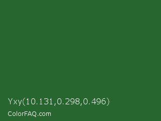 Yxy 10.131,0.298,0.496 Color is a dark green color and the nearest color is Mughal Green #306030. Hex code #27662e and RGB value is rgb(39,102,46). In RGB color space, this color is composed of 15% red, 40% green, 18% blue, In CMYK color space, this color is composed of 62% cyan, 0% magenta, 55% yellow , 60% black , In HSL color space, this color has a hue angle of 127° , 45% saturation and 28% lightness.