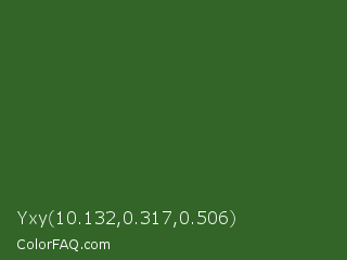 Yxy 10.132,0.317,0.506 Color is a dark green color and the nearest color is Mughal Green #306030. Hex code #326527 and RGB value is rgb(50,101,39). In RGB color space, this color is composed of 20% red, 40% green, 15% blue, In CMYK color space, this color is composed of 50% cyan, 0% magenta, 61% yellow , 60% black , In HSL color space, this color has a hue angle of 109° , 44% saturation and 27% lightness.