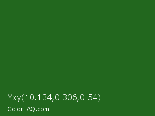 Yxy 10.134,0.306,0.54 Color is a dark green color and the nearest color is Mughal Green #306030. Hex code #22671e and RGB value is rgb(34,103,30). In RGB color space, this color is composed of 13% red, 40% green, 12% blue, In CMYK color space, this color is composed of 67% cyan, 0% magenta, 71% yellow , 60% black , In HSL color space, this color has a hue angle of 117° , 55% saturation and 26% lightness.