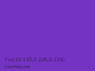 Yxy 10.135,0.226,0.124 Color is a normal violet color and the nearest color is Purple Heart Crayola #652dc1. Hex code #7533c4 and RGB value is rgb(117,51,196). In RGB color space, this color is composed of 46% red, 20% green, 77% blue, In CMYK color space, this color is composed of 40% cyan, 74% magenta, 0% yellow , 23% black , In HSL color space, this color has a hue angle of 267° , 59% saturation and 48% lightness.