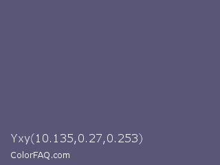 Yxy 10.135,0.27,0.253 Color is a normal indigo color and the nearest color is Comet #5c5d75. Hex code #595678 and RGB value is rgb(89,86,120). In RGB color space, this color is composed of 35% red, 34% green, 47% blue, In CMYK color space, this color is composed of 26% cyan, 28% magenta, 0% yellow , 53% black , In HSL color space, this color has a hue angle of 245° , 17% saturation and 40% lightness.