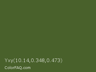 Yxy 10.14,0.348,0.473 Color is a dark green color and the nearest color is Dark Moss Green #4a5d23. Hex code #49612b and RGB value is rgb(73,97,43). In RGB color space, this color is composed of 29% red, 38% green, 17% blue, In CMYK color space, this color is composed of 25% cyan, 0% magenta, 56% yellow , 62% black , In HSL color space, this color has a hue angle of 87° , 39% saturation and 27% lightness.