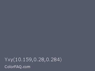 Yxy 10.159,0.28,0.284 Color is a normal blue color and the nearest color is Black Coral #54626f. Hex code #55596c and RGB value is rgb(85,89,108). In RGB color space, this color is composed of 33% red, 35% green, 42% blue, In CMYK color space, this color is composed of 21% cyan, 18% magenta, 0% yellow , 58% black , In HSL color space, this color has a hue angle of 230° , 12% saturation and 38% lightness.