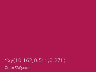 Yxy 10.162,0.511,0.271 Color is a normal rose color and the nearest color is French Wine #ac1e44. Hex code #ae174e and RGB value is rgb(174,23,78). In RGB color space, this color is composed of 68% red, 9% green, 31% blue, In CMYK color space, this color is composed of 0% cyan, 87% magenta, 55% yellow , 32% black , In HSL color space, this color has a hue angle of 338° , 77% saturation and 39% lightness.